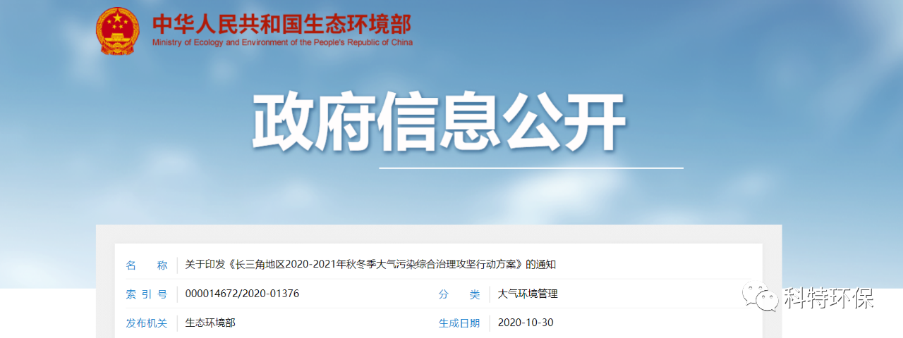 生態(tài)環(huán)境部、國家發(fā)展和改革委員會、工業(yè)和信息化部等10部門與上海、江蘇、浙江、安徽等4?。ㄊ校┤嗣裾?lián)合印發(fā)《長三角地區(qū)2020-2021年秋冬季大氣污染綜合治理攻堅行動方案》(以下簡稱《行動方案》)